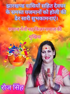 देवघर के नारायण सेवा अनाथ आश्रम में आज किन्नर समाज के किन्नर ने बच्चों के साथ होली मनाई देवघर के किन्नर समाज की मुखिया रोज मौसी अपने पूरे टीम के साथ नारायण आश्रम पहुंचे जहां पर अनाथ बच्चों के साथ अबीर गुलाल लगाकर होली मनाई और उनके साथ बैठकर खाना भी खाया मौके पर किन्नर समाज के किन्नर ने अपने नृत्य और गीत भी प्रस्तुत किया मौके पर रोज मौसी किन्नर समाज के मुखिया ने कहा कि हमारा भी परिवार नहीं है और इन बच्चों का भी परिवार नहीं है